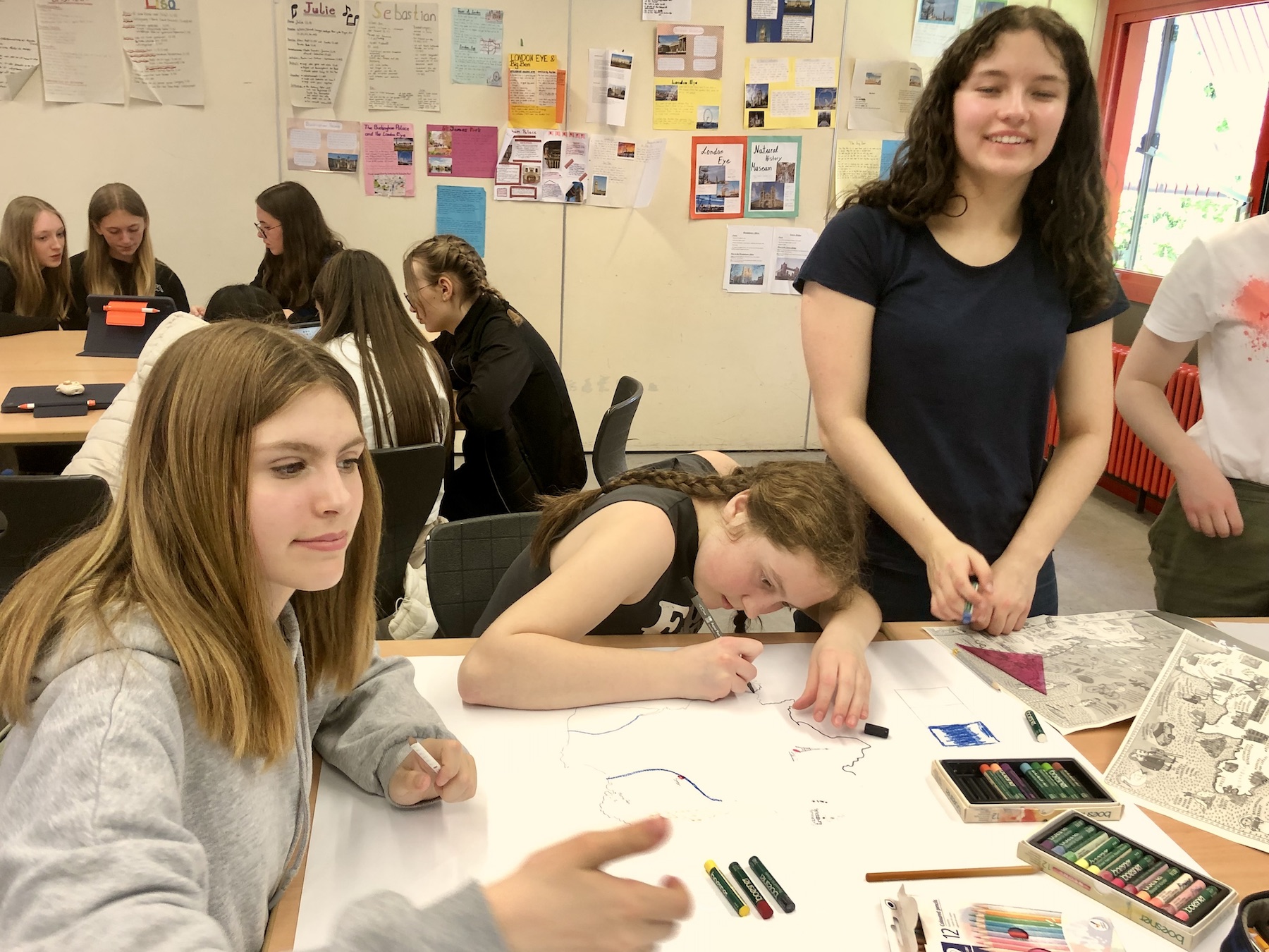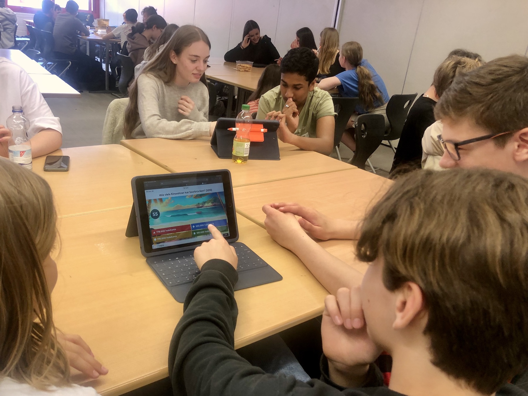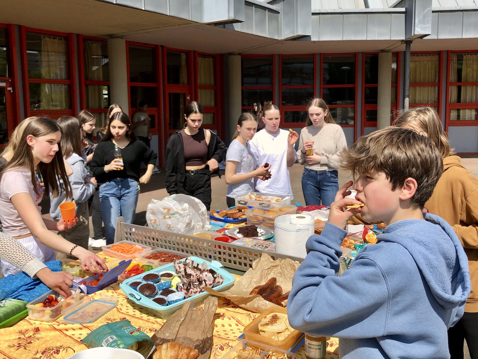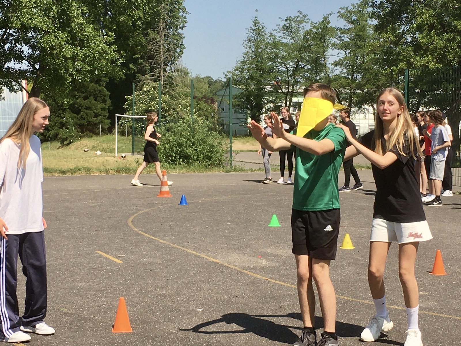 Nach einer herzlichen Begrüßung unserer Gäste von unserem stellvertretenden Schulleiter Christian Dahlke, starteten wir mit unterschiedlichen Sportspielen in der Turnhalle und auf dem Sportplatz. Wir kooperierten, schwitzen und die Jungs gaben alles beim Fußball, Deutschland gegen Frankreich. Bei einem großen Picknick auf dem Schulhof stärkten wir uns für das Nachmittagsprogramm. Hier arbeiteten wir gemeinsam mit den Austauschpartnern an unterschiedlichen Ateliers zur deutschen und französischen Sprache und Kultur. Die Kommunikation stand dabei im Vordergrund. Besonders gut hat allen das Kahout-Quiz gefallen, das wir im Vorfeld selbst entworfen hatten. Nachmittags gingen wir dann jeweils mit den französischen Schülern in unsere Familien, aßen Eis in der Stadt, besichtigten den Zoo oder spielten Fußball. Am nächsten Morgen waren wir alle etwas müde, aber glücklich Freunde und Klassenkameraden wiederzusehen und zu hören, wie der Abend bei den Anderen war, alle waren begeistert!