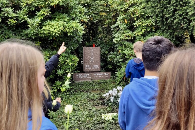 Am Freitag, dem 10. Oktober, gingen die Schüler der 5er Klassen zum Friedhof St. Johann, um am Grab von Willi Graf an ihn und sein kurzes Leben zu denken. Gemeinsam mit Schulpfarrer Bernd Schütz und ihren Fachlehrern legten sie an Willi Grafs Grab weiße Rosen nieder. An Willi Grafs Todestag fand dann am Sonntag nachmittag noch ein Gedenkgottesdienst in der Jugendkirche eli.ja statt.