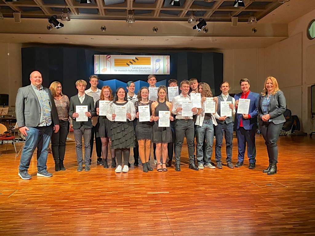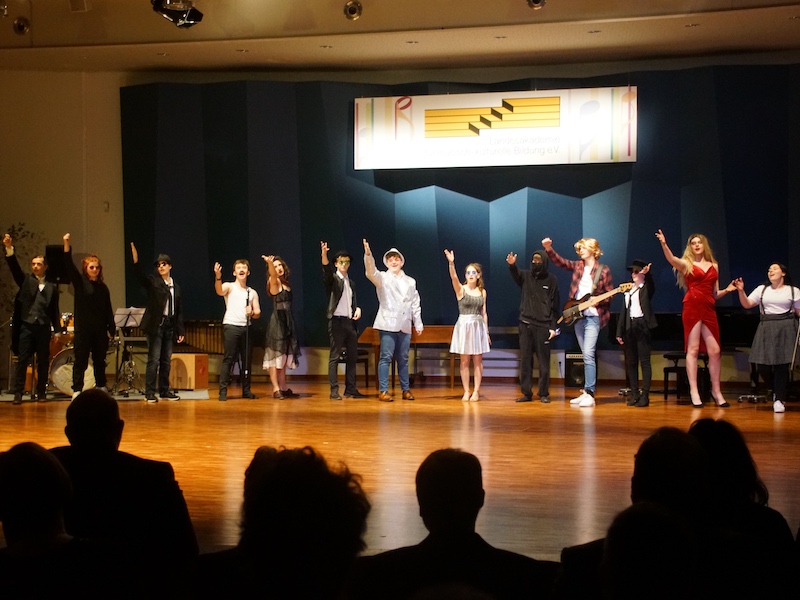 In einer selbst gestalteten Abschlusspräsentation – in der Colin Scholl souverän als Moderator fungierte – zeigten die Schülerinnen und Schüler im Alter von 15 bis 19 Jahren ein breites Spektrum ihrer Ausbildungsinhalte mit Darstellendem Spiel, Chorgesang, Tanz sowie Musizieren in verschiedenen Ensemble-Formationen und konnten alle Gäste, insbesondere die anwesenden Kolleginnen und Kollegen der Willi-Graf-Schulen von ihrem Potential überzeugen. Nach einem tosenden Applaus und einer Zugabe erhielten die Schülerinnen und Schüler aus den Händen der Ministerin für Bildung und Kultur, Frau Christine Streichert-Clivot, und der Projektleiterin Eva Kieser von der Landesakademie ihre Zertifikate.