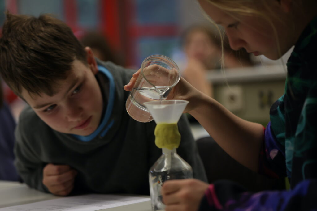 Die Durchführung von Experimenten spielt dabei eine große Rolle. In Doppelstunden wird gebaut und experimentiert, gemessen und beobachtet, gemischt und gefiltert. Anschließend werden die Versuche und die Beobachtungen aufgeschrieben und festgehalten.