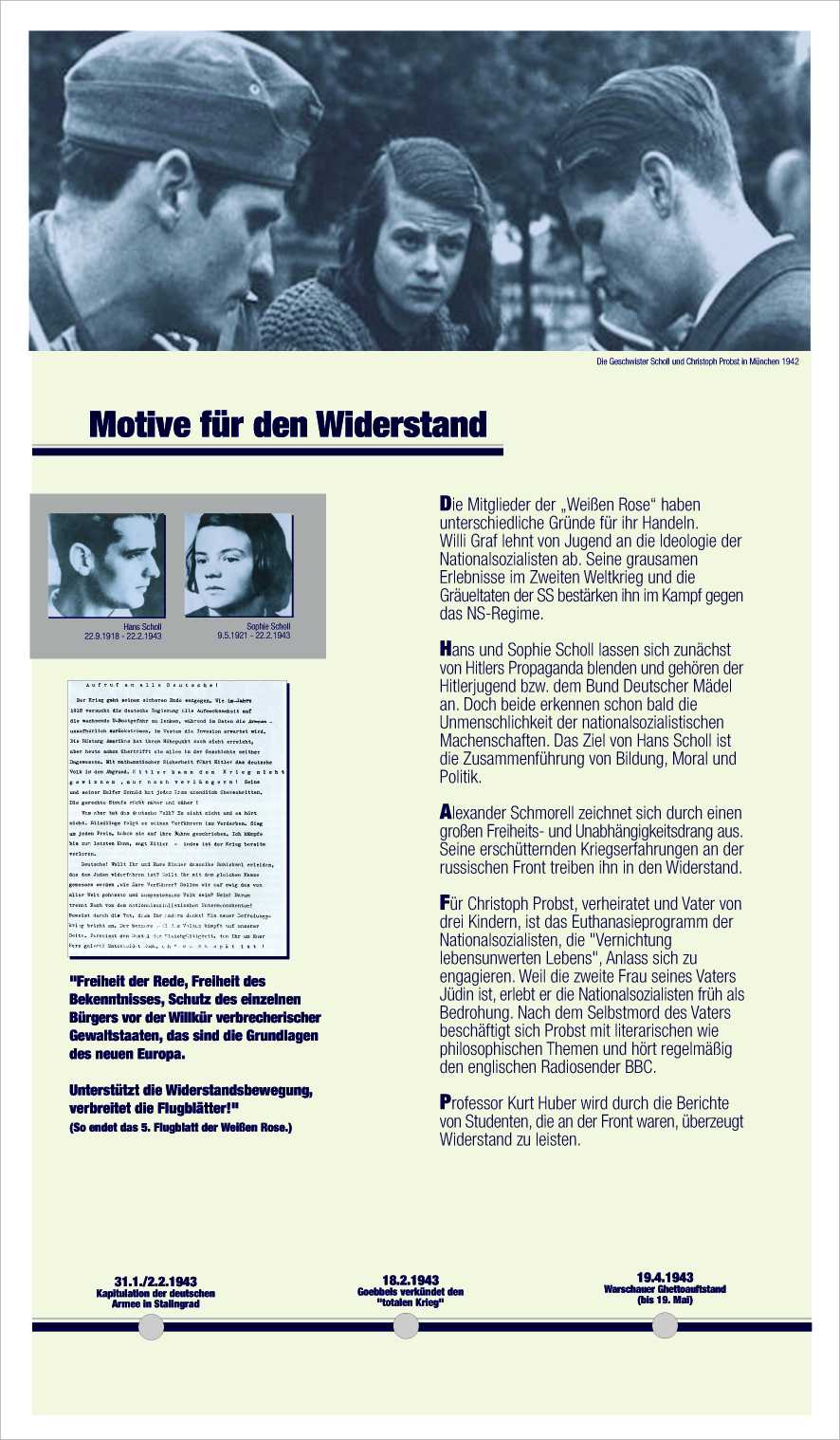 Mit Flugblattaktionen sollte die Bevölkerung aufgerüttelt werden. Am 18. Februar 1943 warfen Hans und Sophie Scholl solche Flugblätter in den Lichthof der Münchner Universität. Dabei wurden sie verhaftet. Am Abend des gleichen Tages wurde auch Willi Graf verhaftet. Hans und Sophie Scholl wurden am 22. Februar 1943 hingerichtet. Willi Graf wurde am 12. Oktober 1943 in München Stadelheim hingerichtet.