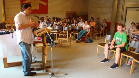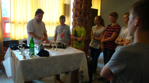 Der Vortrag von Arie Rosen brachte den Achtklässler durch die vielen Beispiele den jüdischen Alltag näher. Es war eine Darbietung für alle Sinne. Die Schülerinnen und Schüler konnten mit verfolgen, wie man die Gebetsriemen, die Teffilin, anlegt, eine Mesusa bewundern, die Gebetskapsel für einen Türrahmen, eine Tora aufrollen und auch an den Gewürznelken in der Besamim-Büchse riechen, die den Duft über den Schabbat hinaus in der Nase behalten lässt. Arie Rosen gelang es sogar, dass die Schülerinnen und Schüler sich trauten ein Kinderlied zum Schabbat kräftig mitzusingen. Auch lauschten sie gespannt den von Arie Rosen gesungenen hebräischen Segensworten.