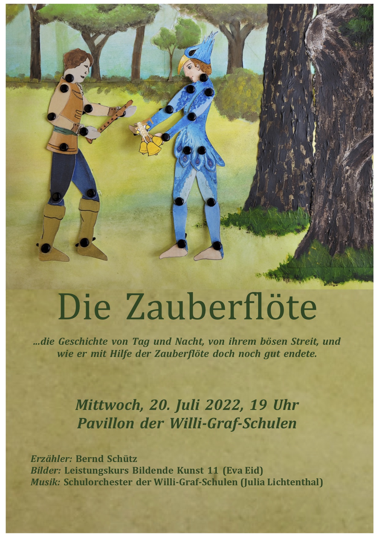 Am 20. Juli 2022 nähern wir uns diesem Superhit der Opernliteratur auf ganz besondere Weise an: Die Concert Band, das Schulorchester der Willi-Graf-Schulen, wird unter der musikalischen Leitung von Julia Lichtenthal eine Orchesterfassung der Zauberflöte darbieten. Hinzu kommen eine spannende Erzählung (Bernd Schütz) und Bildaufnahmen eines analogen Papiertheaters, das Schülerinnen des Leistungs­kurses Bildende Kunst der Jahrgangsstufe 11 (Leitung: Eva Eid) geschaffen haben.