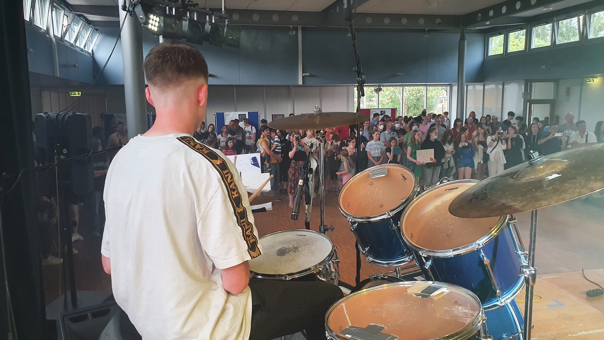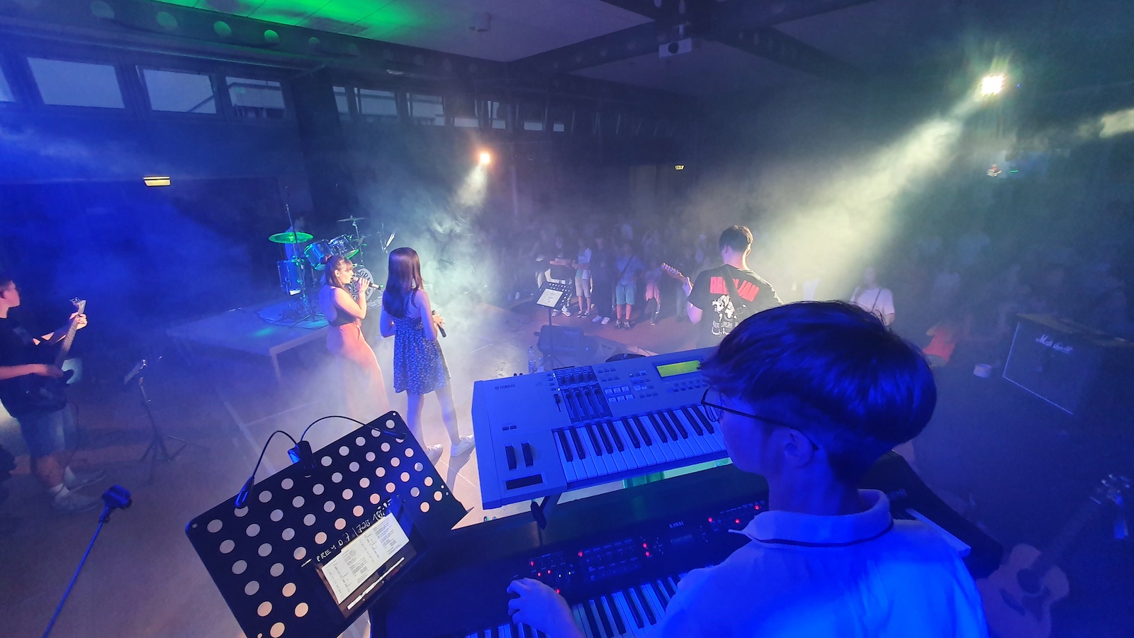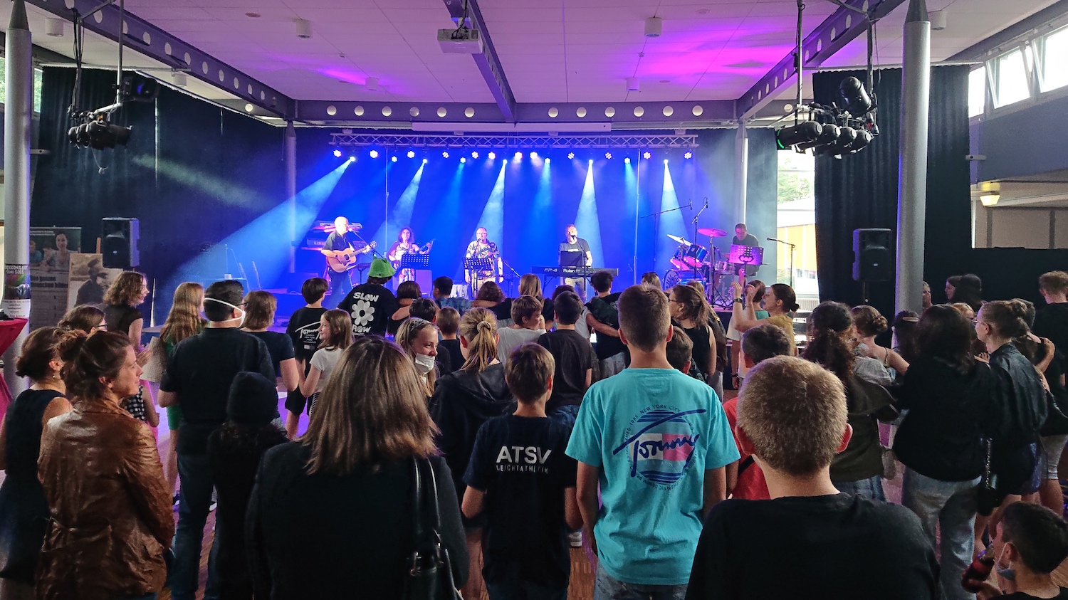 Das im Jahre 2020 ausgefallene, 2021 kurzfristig abgesagte und seit langem erwartete Rockkonzert an den Willi-Graf-Schulen fand nun endlich im Juni 2022 statt! Entsprechend voll war der Pavillon am Donnerstagabend (30.06.2022) und die Erwartungen waren groß… Etliche Proben – mitunter auch am Wochenende – gingen dem Auftritt voraus. Technik, Licht, Catering, Plakatierung mussten im Vorfeld organisiert und am Konzertabend für entspannte Atmosphäre sorgen. Ohne die zahlreichen Helfer, Schüler, Lehrer – auch ehemalige Musiklehrer -, Eltern, Hausmeister, Tontechniker wäre das alles so nicht möglich. Die Gesamtorganisation oblag Musiklehrer Holger Ringeisen, der dann am späteren Konzertabend auch entsprechend mit lautstarken „Holger“-Sprechchören gewürdigt wurde.