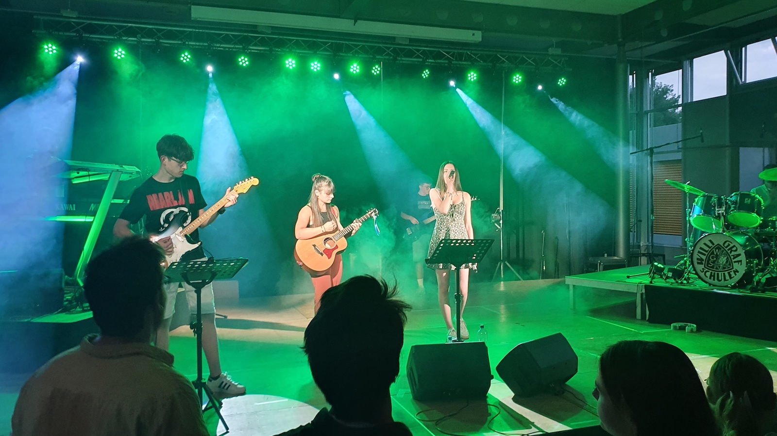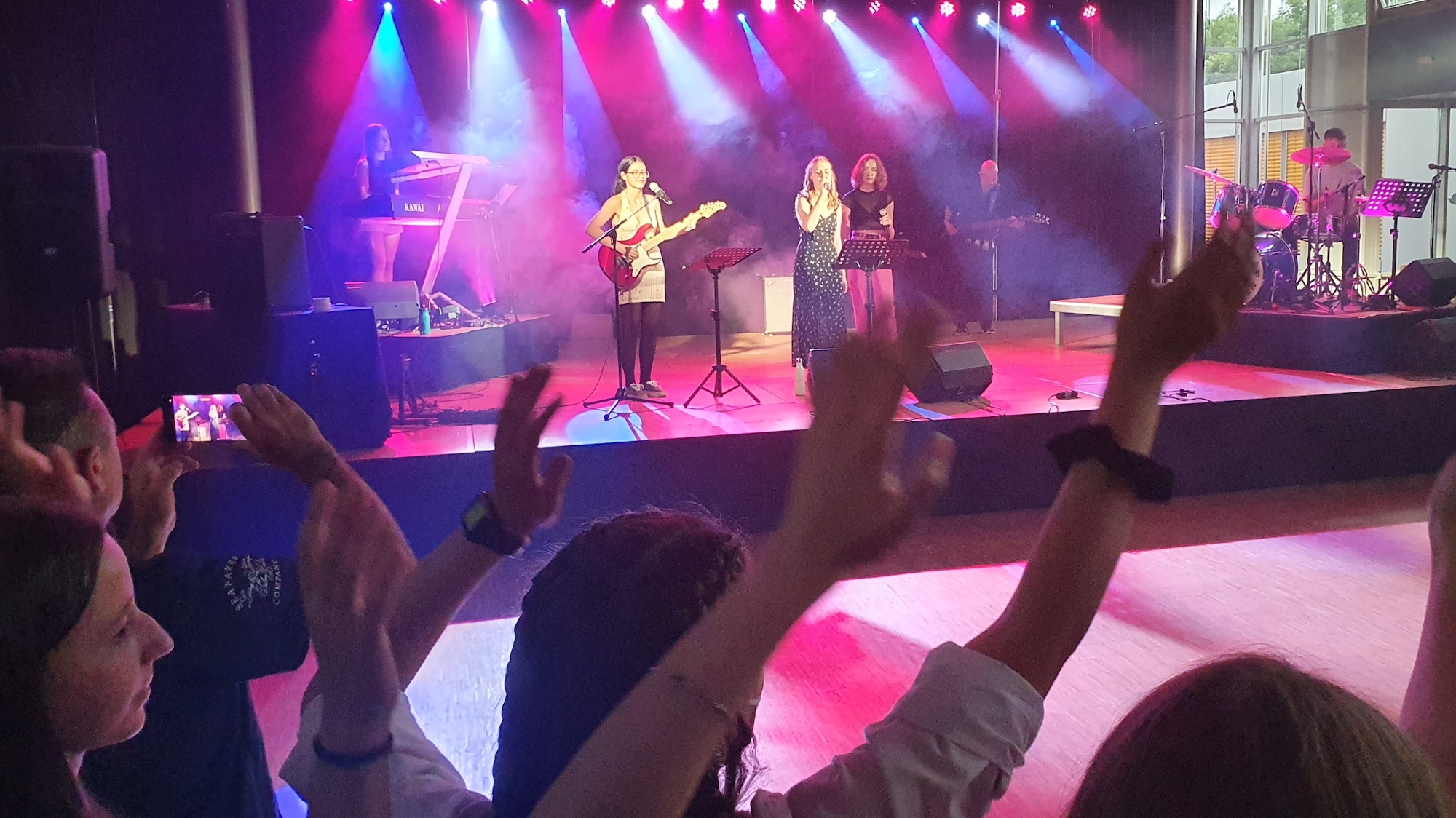 Den Auftakt machte wie gewohnt die Lehrerband mit einer ausgewogenen Musikmischung: Titel von den Beatles waren ebenso dabei, wie von Oasis, Sting, Savage Garden, Coldplay oder Elton John. Zwischen den Songs erinnerte man mit der Auswahl an den 80. Geburtstag von Paul McCartney oder man forderte durch „Russians“ (Sting) in der moderneren Celloversion die Beendigung des Krieges in der Ukraine. Der Spaß an der Musik stand allerdings im Vordergrund und so wurden die Lehrer am Ende auch mit Zugabe-Rufen bedacht, denen sie allerdings nicht nachkamen, da das Programm weitergehen musste.