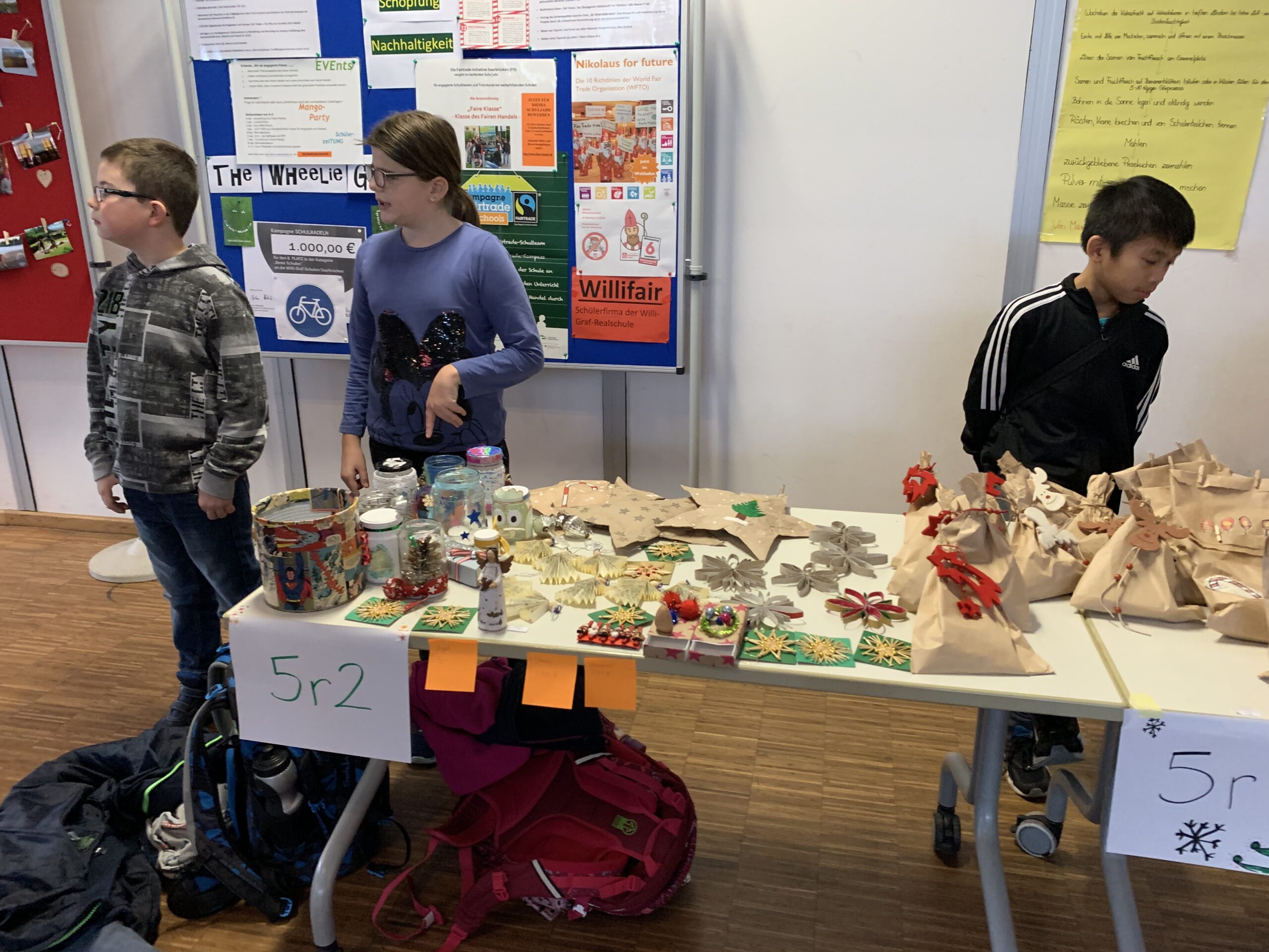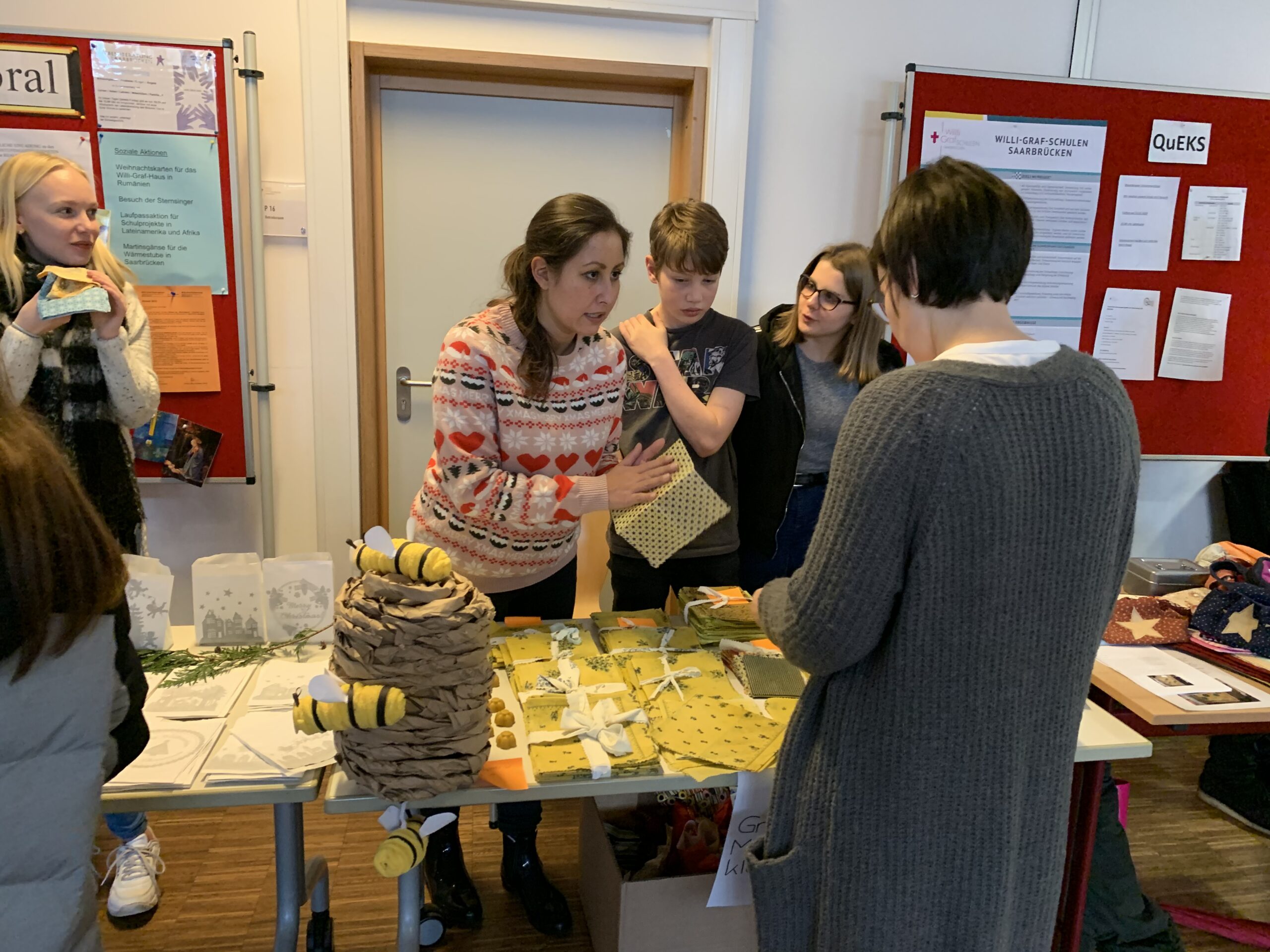 Voller weihnachtlicher Vorfreude haben sich zahlreiche Schülerinnen und Schüler der Fairtrade Klassen der Willi Graf Realschule am diesjährigen Adventsbasar beteiligt. Wieder wurde gemeinsam gebastelt, gebacken und schließlich an Ständen für einen guten Zweck verkauft. Mit von den Schülern selbstgebastelten Dekoartikeln, mit selbstproduziertem Honig und Wachstüchern, mit Tiffany- und Tonarbeiten sowie Zimtwaffeln und Crêpes bot sich sich ein großes Angebot.  „Weltraum“ vom St. Johanner Markt und „Unverpackt“ vervollständigten das zahlreiche Angebot.