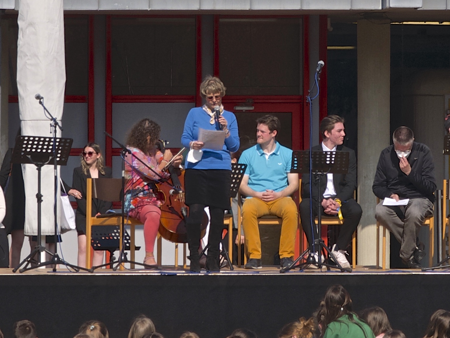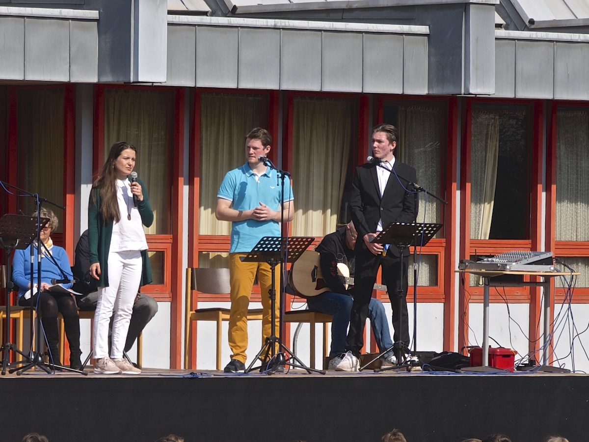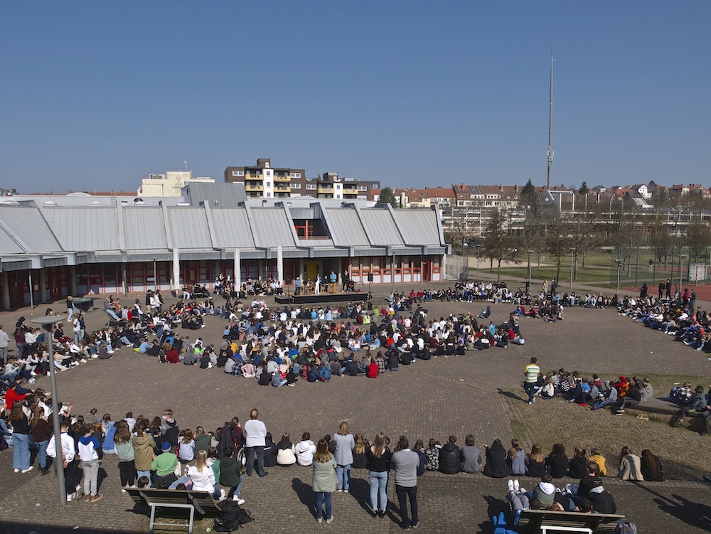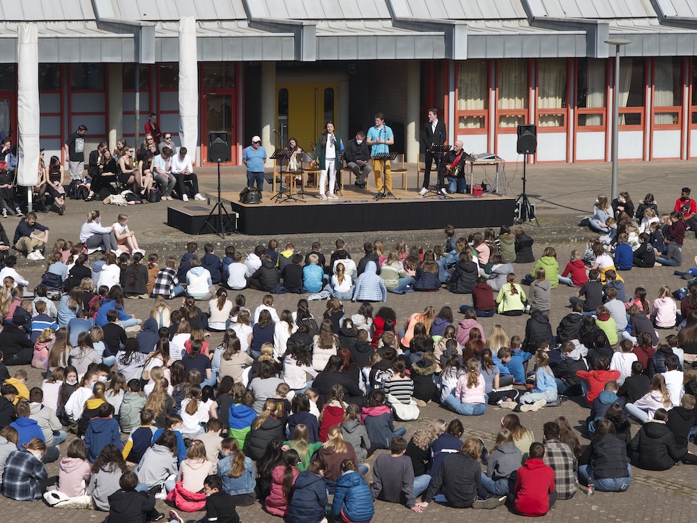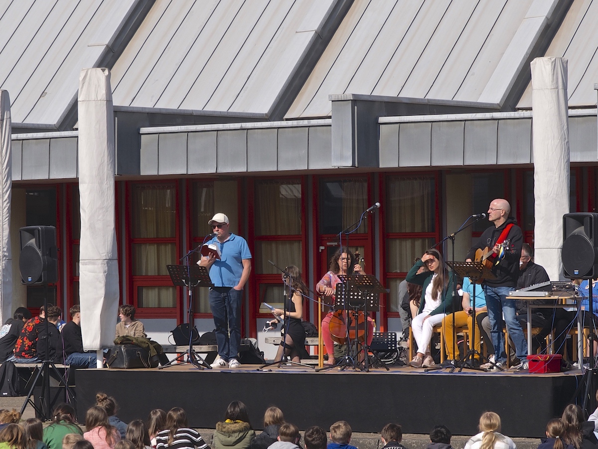 Die beiden Schüler Felix Schlicher und Andre Ukrow stellten Fragen über die Flucht, nach ihrem alten und ihrem neuen Leben. Anastasia bedankte sich äußerst herzlich für alle Hilfen und die Möglichkeit, hier sprechen zu dürfen. Sie rief zu einem friedlichen Miteinander aller Menschen auf. Auch die russische Bevölkerung wolle keinen Krieg, sondern nur in Ruhe und Frieden leben. Weitere musikalische Beiträge waren die Interpretation des Sting- Klassikers „Russians“ und das abschließende „Schalom“, in das die ganze Schulgemeinschaft mit einstimmte. Alle Beiträge honorierte die Schulgemeinschaft mit gespanntem Interesse und großem Applaus. Selbst das Wetter konnte nicht anders und spielte mit strahlendem Sonnenschein und fast sommerlichen Temperaturen mit und trug seinen Teil zum Gelingen des Open-Air-Events bei. Es herrschte während des etwa halbstündigen Gedenkens eine beeindruckend aufmerksame und andächtige Atmosphäre. Hier wurde allen Beteiligten deutlich, welches Leid dieser Krieg mit sich bringt und wie wichtig unsere Unterstützung sowohl moralischer als auch materieller und finanzieller Art ist.