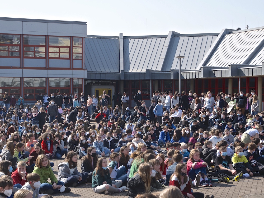 Statt fassungslos zuzuschauen, wollten wir ein sichtbares Zeichen setzen. Deshalb gestaltete am Freitag, den 25. März 2022, die gesamte Schulgemeinschaft der Willi-Graf-Schulen ein Friedensgebet auf dem großen Pausenhof unter freiem Himmel. Dabei war ein Interview mit der Ukrainerin Anastasia Sjch, die ins Saarland geflüchtet ist, ein authentisches und sehr bewegendes Zeugnis der Verzweiflung. Punkt 11 Uhr versammelten sich über tausend Schülerinnen und Schüler mit ihren Lehrern auf dem Schulhof. Dort eröffneten die Musiklehrer Jochen Clemens, Heidrun Mertes und Holger Ringeisen die Veranstaltung mit der gesungenen Bitte „Komm, heil’ger Geist“. Mitglieder unseres Schulpastoralteams, Bernd Schütz und Sandra Jurkat, sensibilisierten durch und mit der Auslegung von Bibelworten die Zuhörerschaft. Im Mittelpunkt stand das Gespräch mit Anastasia. Diese hat mit ihrem kleinen Kind am 24. Februar 2022 zu Beginn des Krieges Kiew verlassen und sich nach Riegelsberg zu Bekannten gerettet. Ihr Mann blieb in Kiew zurück und leistet dort Militärdienst. Seit ein paar Tagen ist auch ihre Mutter hier in Riegelsberg. Dieses Schicksal steht stellvertretend für die Not und Verzweiflung von Millionen Betroffenen.