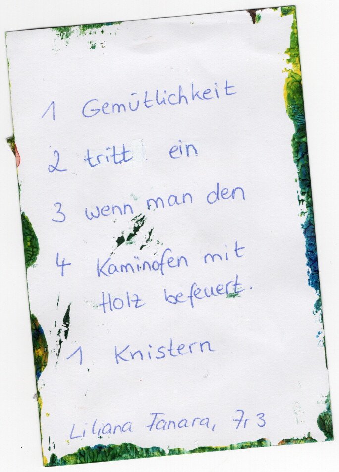 Im Rahmen unseres Schulfestes veranstalteten wir einen Gedichtwettbewerb, der das schönste Elfchen küren sollte. Unsere Gäste schrieben fleißig Texte zu verschiedenen Themen. Angesichts der Masse an lyrischem Material war es schwierig, einen Sieger oder eine Siegerin zu finden. Durchsetzen konnte sich letztlich Liliana Fanara aus der 7r3.