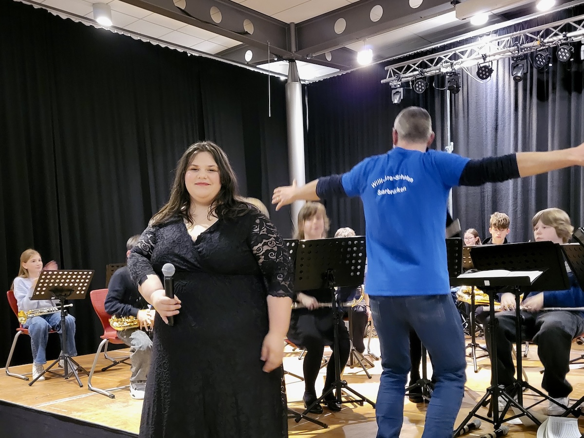 Nach einer Umbaupause übernahmen die Bläser die Bühne. Etwas kleiner an der Zahl, dafür aber gleich mit 2 Klavieren, Pauken und Schlagzeug ausgestattet, eröffneten die 27 Musikerinnen und Musiker die zweite Konzerthälfte mit dem berühmten „Trumpet Voluntary“ von Jeremiah Clarke. Gänsehaut gabs an diesem Abend außerdem nochmal mit dem Welthit „Faded“, gesungen von Pauline Grass. Am Ende des abwechslungsreichen Programms lief das Orchester unter der Leitung von Florian Geibel mit „Final Countdown“ nochmal zu Höchstform auf, bevor sich auch die Juniorband Bläser ihren tosenden und wohlverdienten Schluss-Applaus abholen durfte.