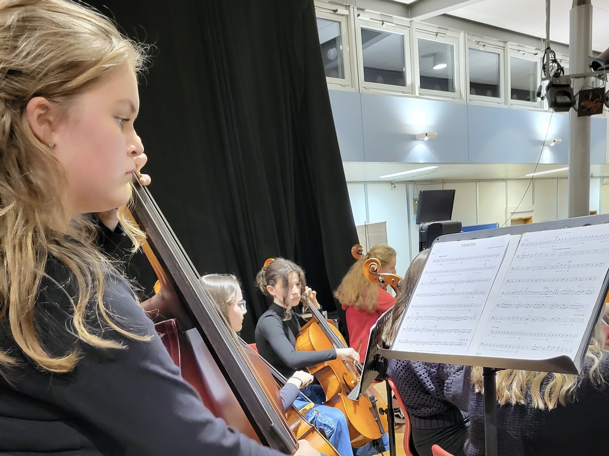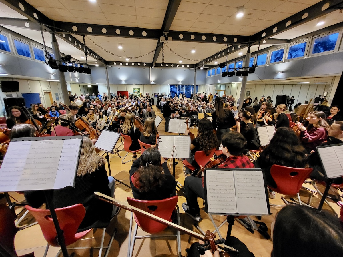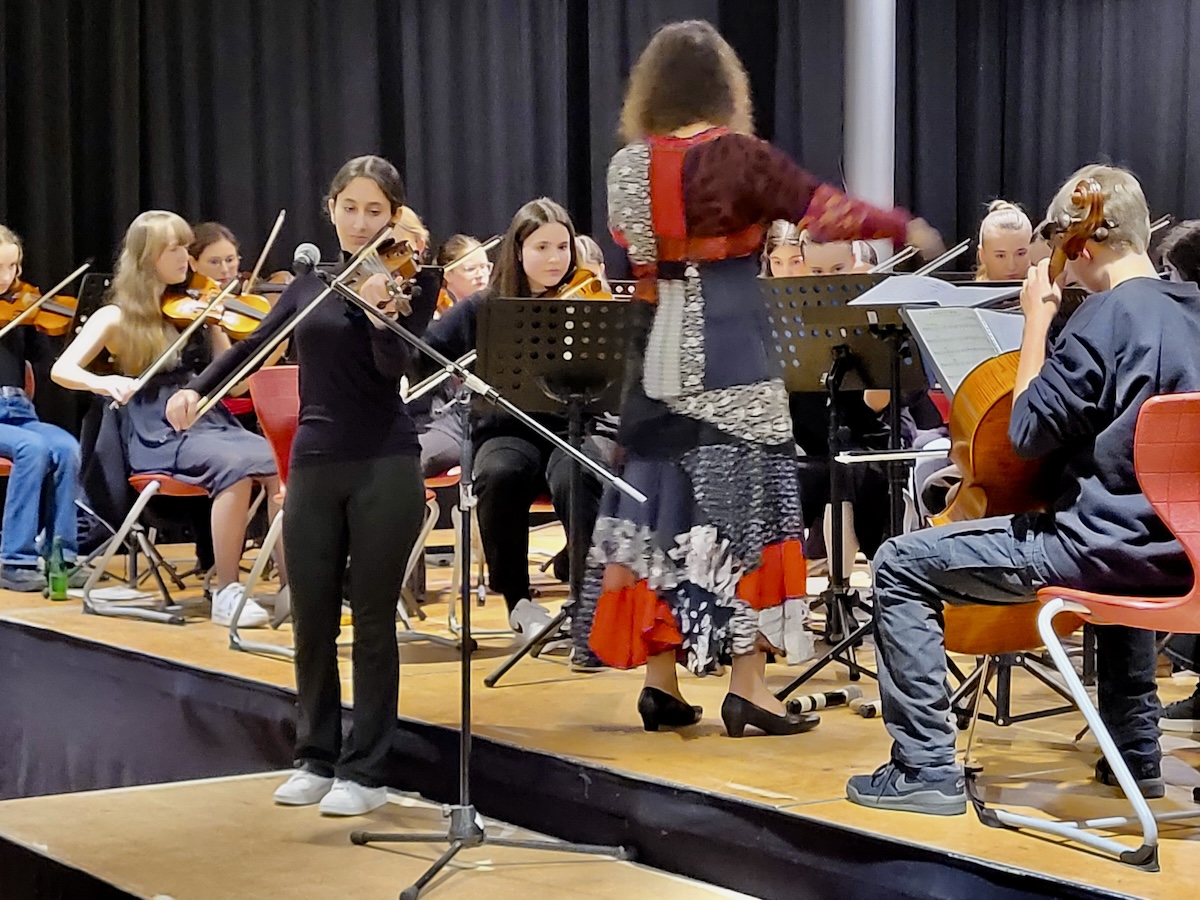 Im bis zum letzten Stuhl besetzten bis in die letzte Ecke gefüllten Pavillon unserer Schule betrat um 18:30 Uhr die Juniorband Streicher mit ihrer Leiterin Heidrun Mertes die Bühne. Gleich mit ihrem ersten Stück (Dragon Dances von Soon Hee Newbold) zogen die Musikerinnen und Musiker die Fans in ihren Bann. Bei „Gabriels Oboe“ mit der Solistin (Emily Ibrahim-Stiffo) an der Violine hörte man sprichwörtlich die berühmte Stecknadel im Saal fallen. Bis zum letzten Ton hielt die Spannung, und der begeisterte und anhaltende Beifall ließ keine Zweifel, dass wir hier mal wieder einen grandiosen Auftritt unserer beeindruckenden sage und schreibe 39-köpfigen Streicher-Formation erleben durften.
