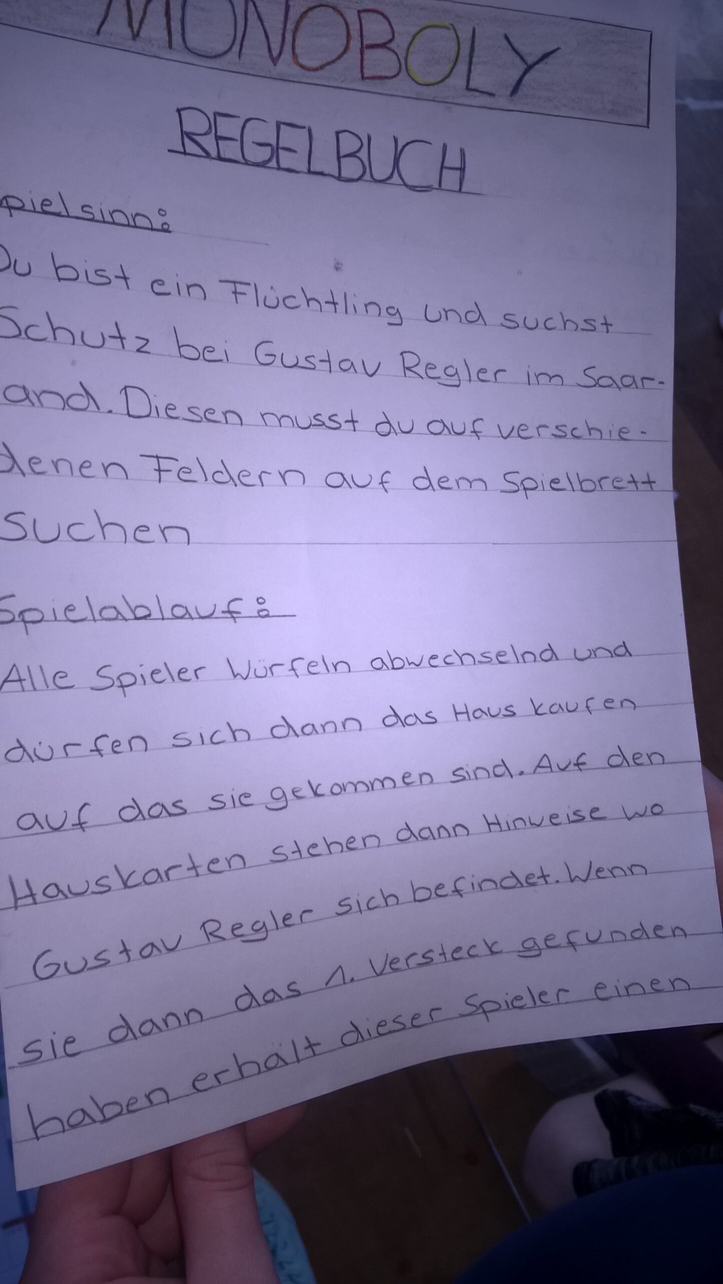Die Meinungsfreiheit ist heute etwas Selbstverständliches. Für Kinder und Jugendliche sind historische Abschnitte, in denen dies nicht der Fall war, daher zunächst schwer zugänglich. Mit dem dunkelsten Kapitel deutscher Geschichte befasste sich die Klasse 7r3 von Herrn Klassen am 18.06.2019 im Rahmen eines Projekttages. Thematisch ging es um konkret um die Phase nach der Machtergreifung Hitlers, als das Saarland noch kurzzeitig durch seinen politischen Status als Zufluchtsort für politisch Verfolgte galt. Wie lebten diese Menschen? Wie konnte man unentdeckt bleiben? Wie arbeitete man mit anderen Verfolgten zusammen? Frau Dr. Graf von der Landeszentrale für politische Bildung und Herr Müller vom Adolf-Bender-Zentrum entwickelten aus diesen Fragen die Idee, ein historisches Spiel für Kinder bzw. Jugendliche zu konstruieren. Die konkrete Umsetzung dieses Projekts nahm sich dann die Willi-Graf-Realschule vor. Nach einem größeren Brainstorming und einigen Unterrichtsstunden waren die ersten Umsetzungen von den Schülerinnen und Schülern der Klasse 7r3 bereit zur Präsentation. Die Kreativität der Klasse war beeindruckend und so erschuf man eine Schnitzeljagd, Kartenspiele oder ein historisches Brettspiel. Im Rahmen des Projekttages wurden unsere Ideen dann dem Saarländischen Rundfunk präsentiert. Den Link zum Beitrag finden Sie weiter unten.