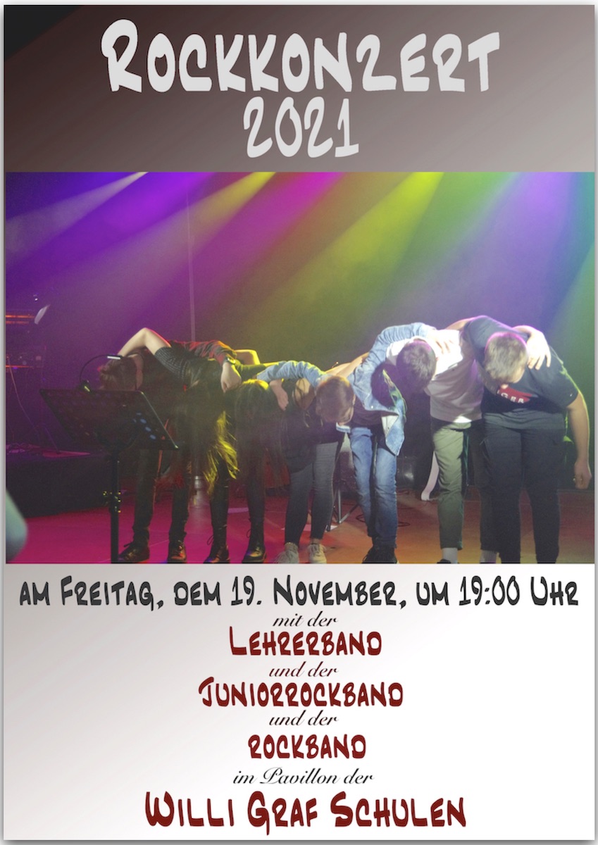 Es geht wieder los! Nach der langen Corona-Zeit findet wieder das traditionelle Rockkonzert der Willi-Graf-Schulen statt. Die 3 Rockbands der Willi-Graf-Schulen laden ein zum Konzert am Freitag, dem 19. November, um 19 Uhr ins Pavillon der Willi-Graf-Schulen.